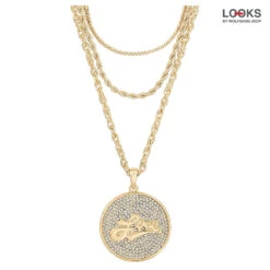 Die Layering Kette – Sparkling Circle besteht aus drei Reihen Ketten und hat einen Anhänger in der Form eines Kreises. Der Anhänger hat die Aufschrift „LOOKS“ und ist mit Strasssteinen verziert.