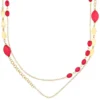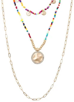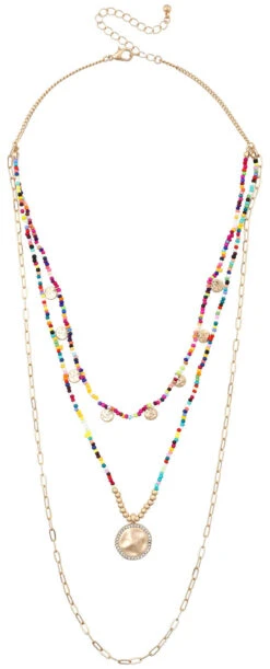 Die Layering Kette – Sparkling Coin ist mehrfarbig und besteht aus drei Reihen, einer Goldfarbenen Gliederkette und zwei Reihen mit bunten Perlen und Anhängern in MĂĽnzform.