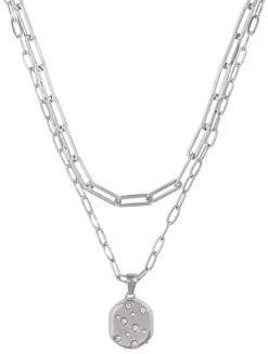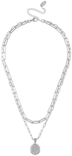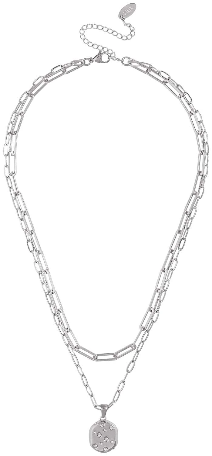 Die Layering Kette – Sparkling Pendant schimmert silberfarben und besteht aus zwei Reihen Ketten in ähnlichen Designs. Die untere Kette ist mit einem Anhänger geschmĂĽckt, welcher mit funkelnden Strasssteinen verziert ist.