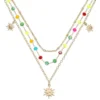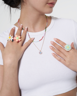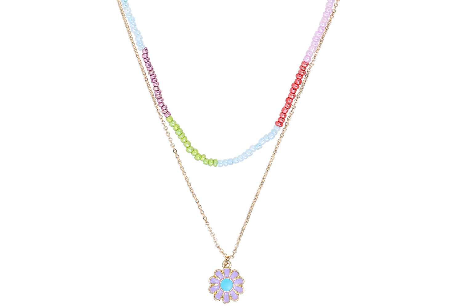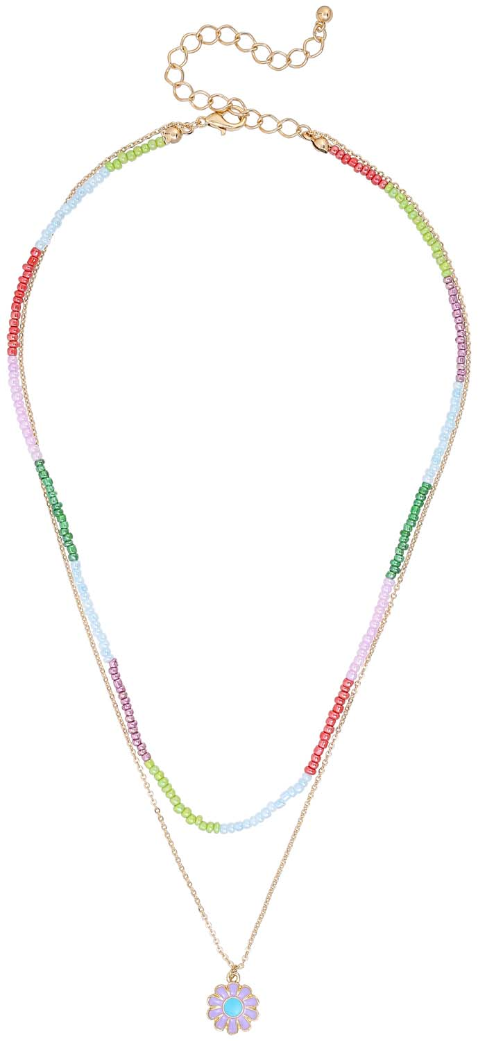 Die Layering Kette – Vibrant Flower schimmert goldfarben und besteht aus zwei Ketten in unterschiedlichen Designs. Die obere Reihe besteht aus mehrfarbigen Kunststoff-Perlen und die untere ist eine Gliederkette. Die Gliederkette hat einen Blumen-Anhänger.