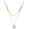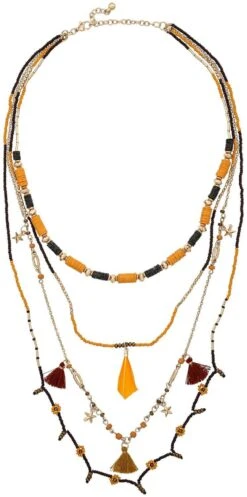 Die Layering Kette – Wild Summer besteht aus vier Reihen Ketten in verschiedenen Designs. Die Ketten sind teilweise mit Glasperlen verziert oder sind in Form einer Gliederkette. Die Layering Kette wird durch Anhänger in Form von Federn und Quasten verziert.