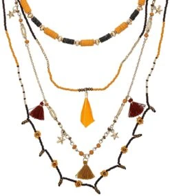 Die Layering Kette – Wild Summer besteht aus vier Reihen Ketten in verschiedenen Designs. Die Ketten sind teilweise mit Glasperlen verziert oder sind in Form einer Gliederkette. Die Layering Kette wird durch Anhänger in Form von Federn und Quasten verziert.