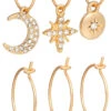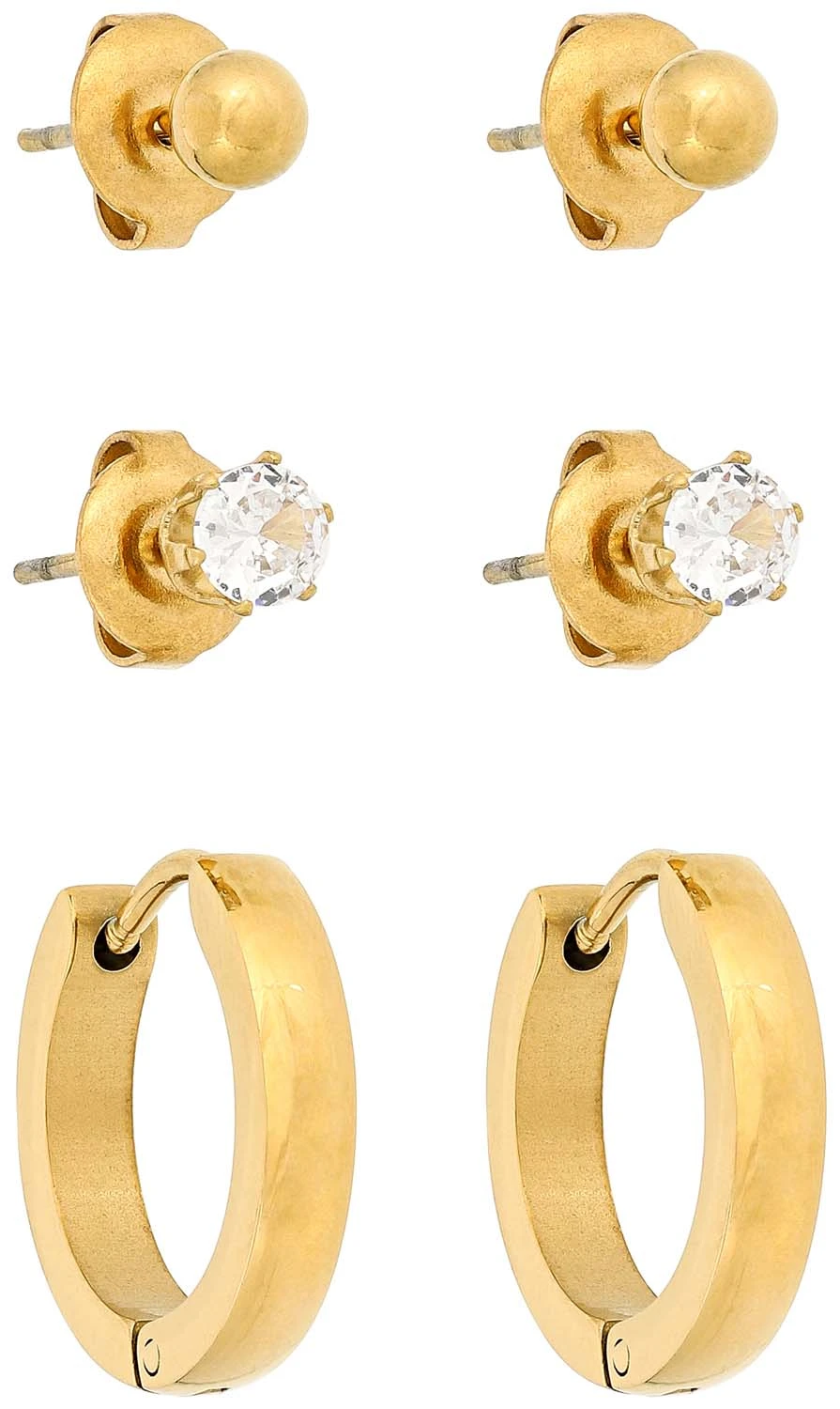 Das Ohr-Set – Golden Favourite schimmert goldfarben und besteht aus drei Paar Ohrringen in unterschiedlichen Designs. Das Set enthĂ€lt zwei Paar Ohrstecker und ein Paar Creolen. Das Set besteht aus Edelstahl und ist teilweise mit Strasssteinen verziert.