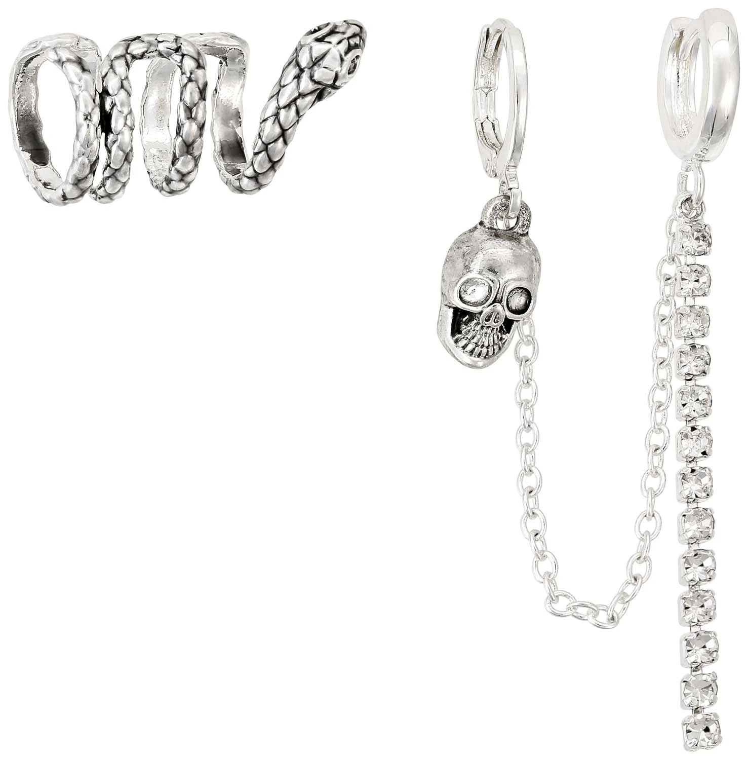 Das Ohr-Set – Shine Snake schimmert silberfarben und besteht aus drei Ohrringen in unterschiedlichen Designs. Das Set beinhaltet zwei Creolen und einen Earcuff. Die Creolen sind durch eine Gliederkette miteinander verbunden.