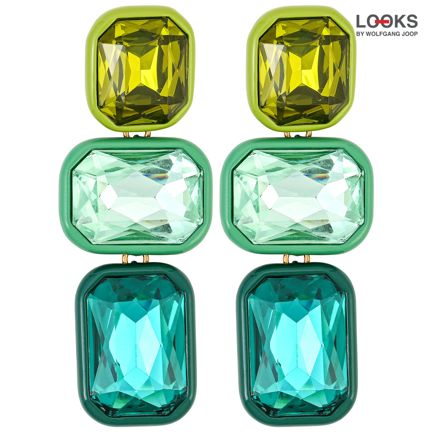 Die Ohrstecker – Crystal Green bestehen aus drei grĂŒnen Rechtecken, die mit groĂen Strasssteinen verziert sind und in verschiedenen GrĂŒntönen glĂ€nzen. Die Ohrringe setzen ein elegantes Statement. Jetzt entdecken in der LOOKS by Wolfgang Joop Kollektion von Bijou Brigitte!
