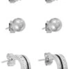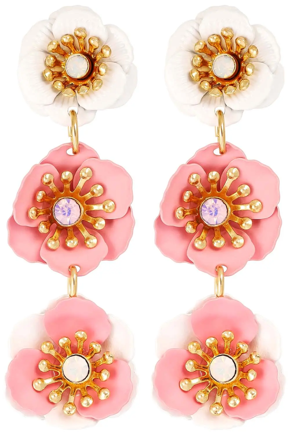 Die Ohrstecker – Flower Trio schimmern goldfarben und bestehen aus drei Blumen, die miteinander verbunden sind. Die oberste Blume ist weiĂ, die mittlere rosa und die unterste ist weiĂ, sowie rosa. Alle Blumen sind jeweils mit einem einem goldfarbenen BlĂŒtenstempel und einem funkelenden Strassstein verziert .