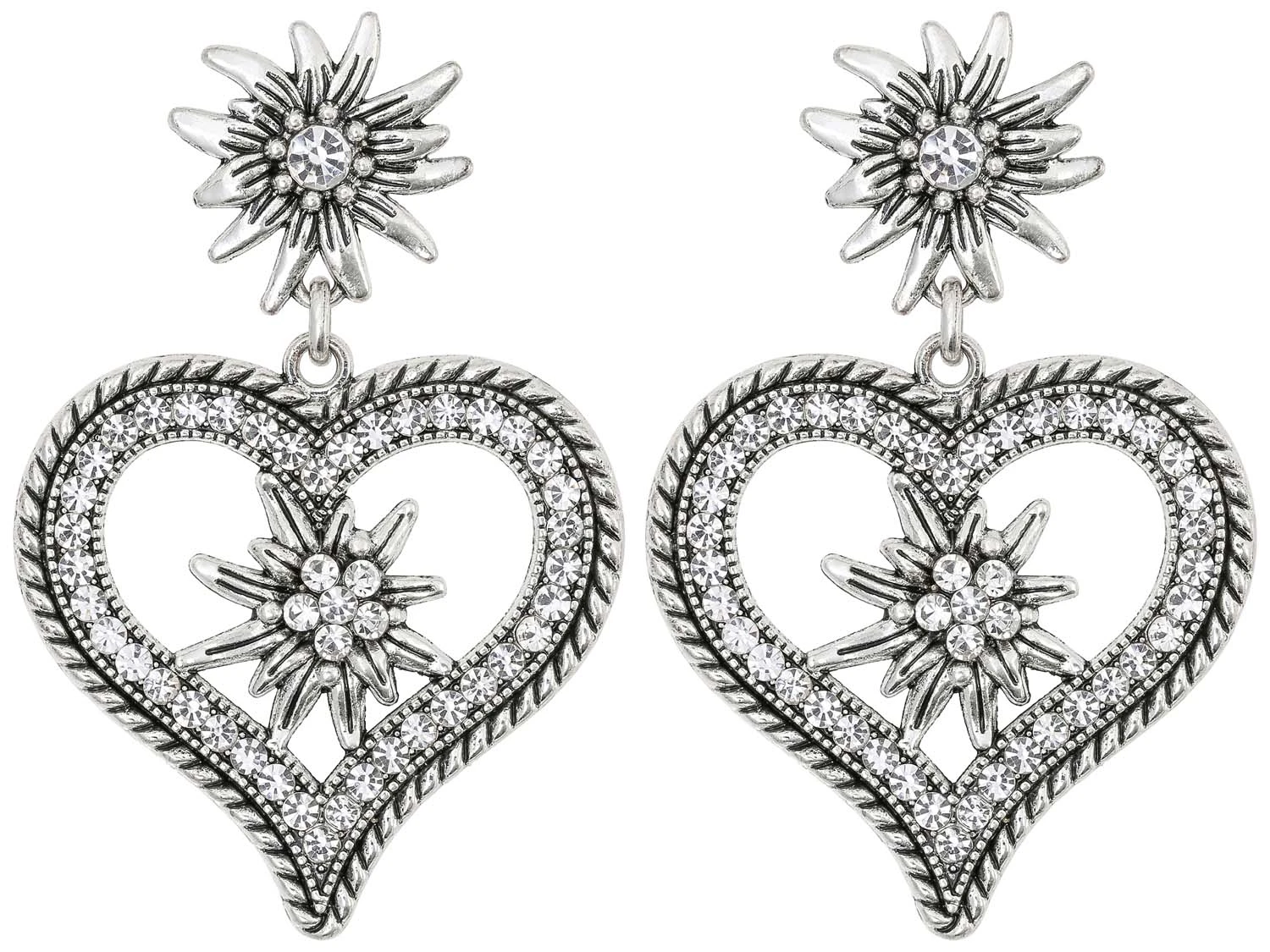 Die Ohrstecker – Love Wiesn schimmern silberfarben und haben die Form von Herzen und Blumen. Die Ohrstecker sind mit Strasssteinen in unterschiedlichen GröĂen verziert, welche diese zu einem richtigen Hingucker machen.