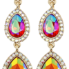Die Ohrstecker – Rainbow Leaves sind goldfarben und mit tropfenförmigen Strasssteinen in Blattform beschmĂŒckt, welche in regenbogenfarben schimmern.