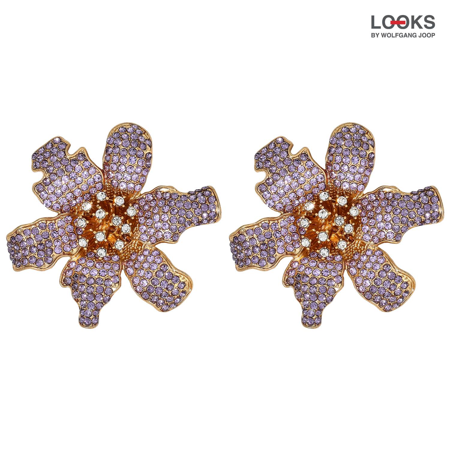 Die Ohrstecker – Sparkling Blossom schimmern goldfarben und haben die Form einer Blume. Die Blume ist mit lilafarbenen und durchsichtigen Strasssteinen verziert. Das Statement-Accessoire zieht alle Blicke auf sich.