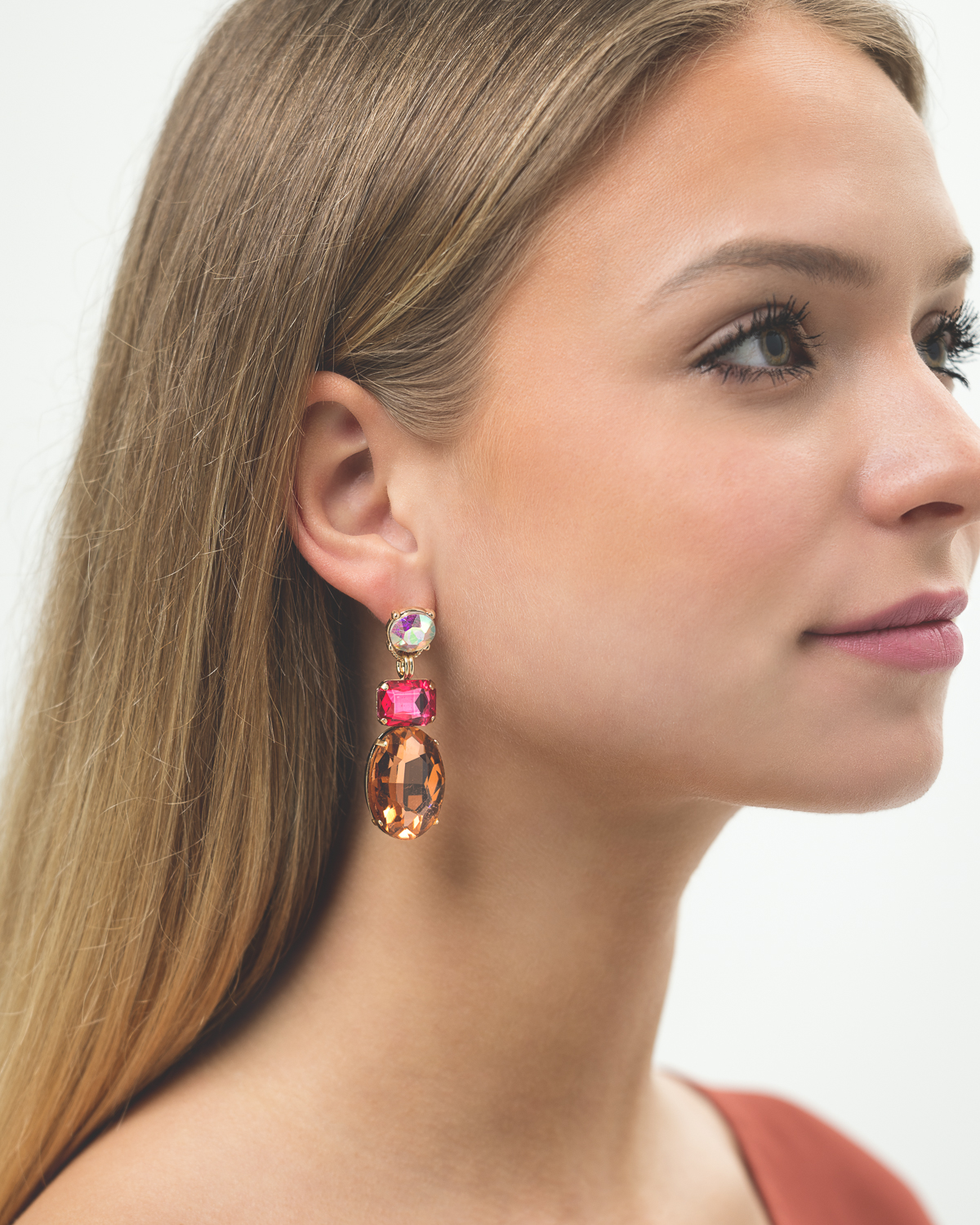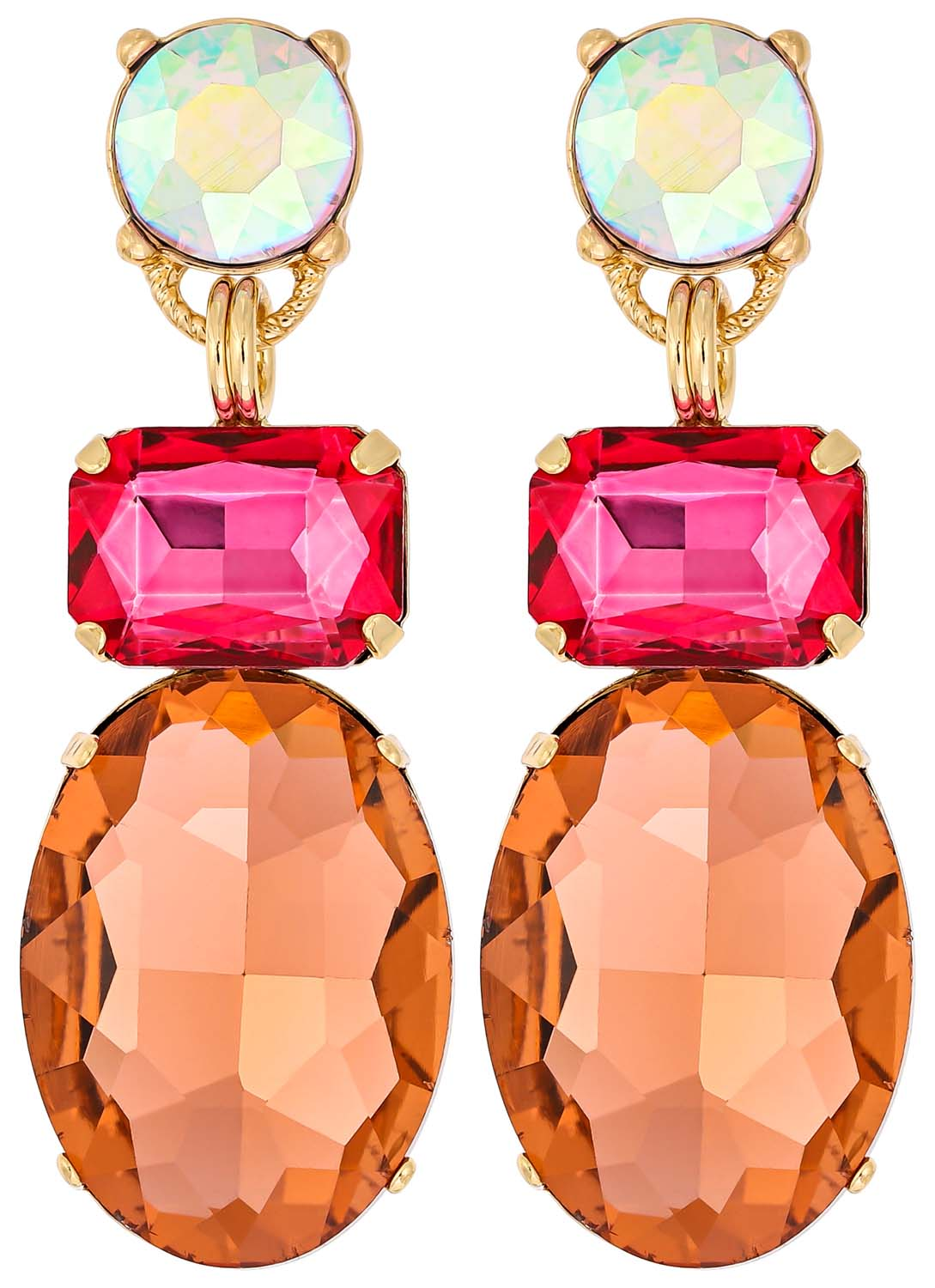 Die Ohrstecker – Sparkling Candy schimmern goldfarben und sind mit Strasssteinen in verschiedenen Formen verziert. Die Strasssteine sind kreisförmig, oval oder quadratisch und funkeln in unterschiedlichen Farben.