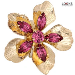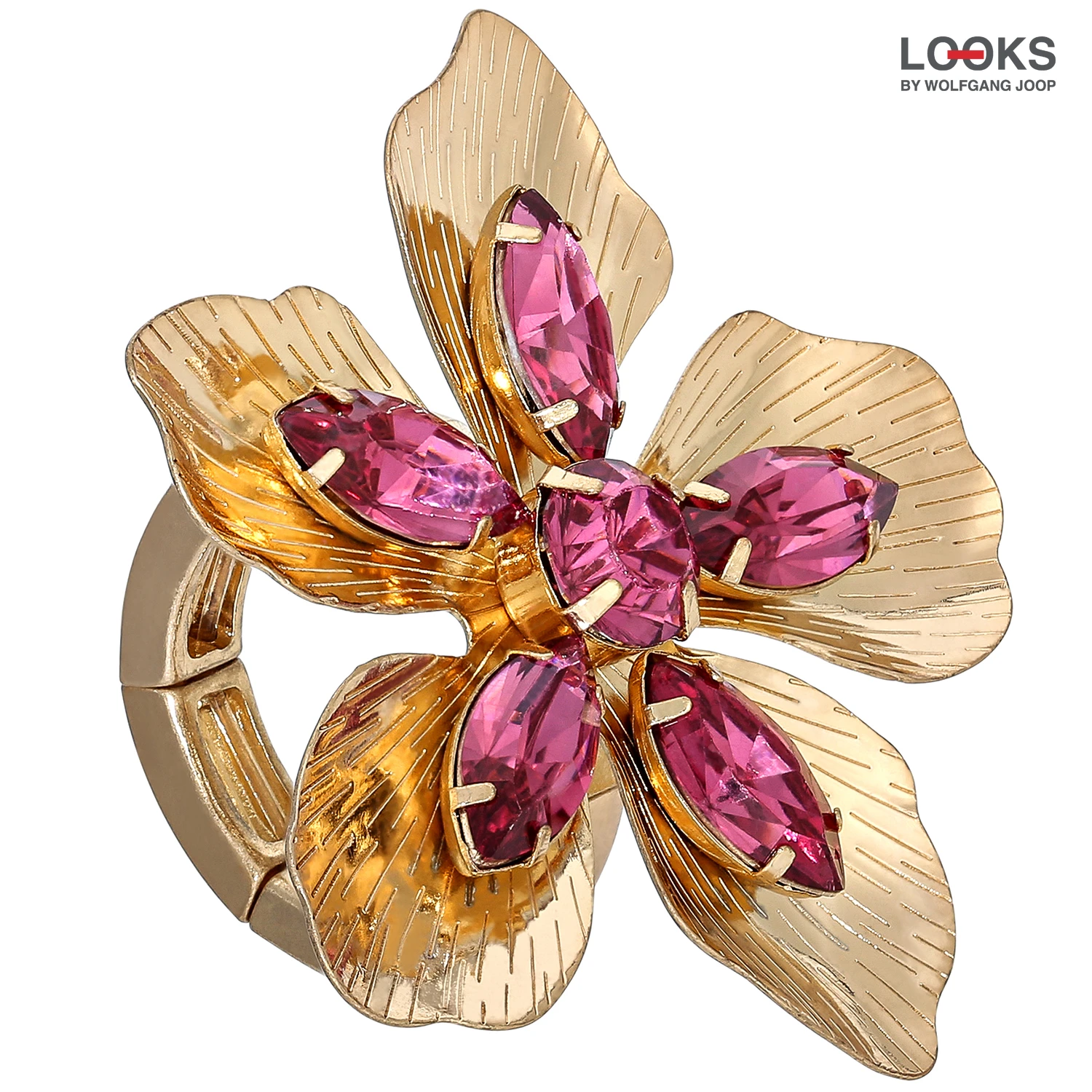 Der Ring – Floral Shine glänzt goldfarben und hat eine groĂźe goldfarbene Blume, die mit pinkfarbenen Strasssteinen verziert ist. Ring ist dehnbar und passt auf jeden Finger. Jetzt entdecken in der LOOKS by Wolfgang Joop Kollektion von Bijou Brigitte!