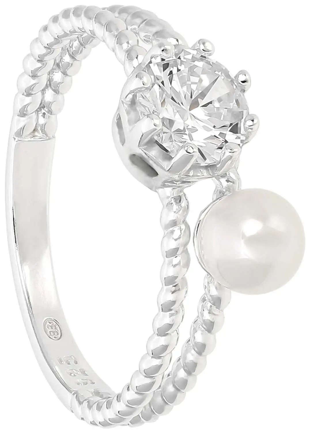 Der Ring – Gorgeous Duo schimmert silberfarben und besteht aus 925er Echtsilber. Er hat zwei Reihen, welche jeweils eine gedrehte Optik haben. Die eine Reihe ist mit einem runden Cubic Zirkonia Stein beschmĂŒckt und die andere Reihe mit einer echten SĂŒĂwasserperle