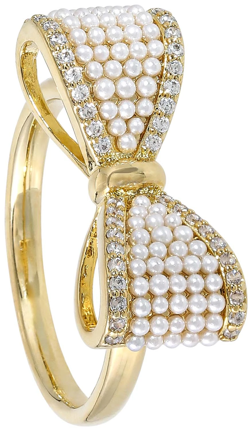 Der Ring – Pearly Bow schimmert goldfarben und ist mit einer Schleife beschmĂŒckt. Die Schleife ist mit vielen kleinen Perlen besetzt und zusĂ€tzlich ringsherum mit Cubic Zirkonia Steinen verziert. Der Ring ist ein wahrer Hingucker.