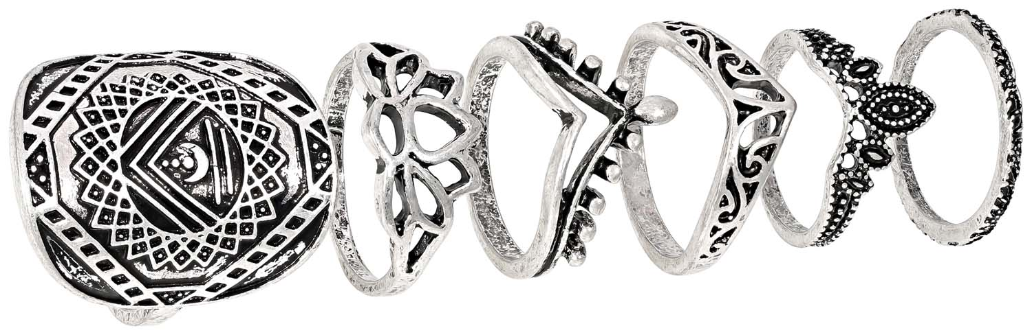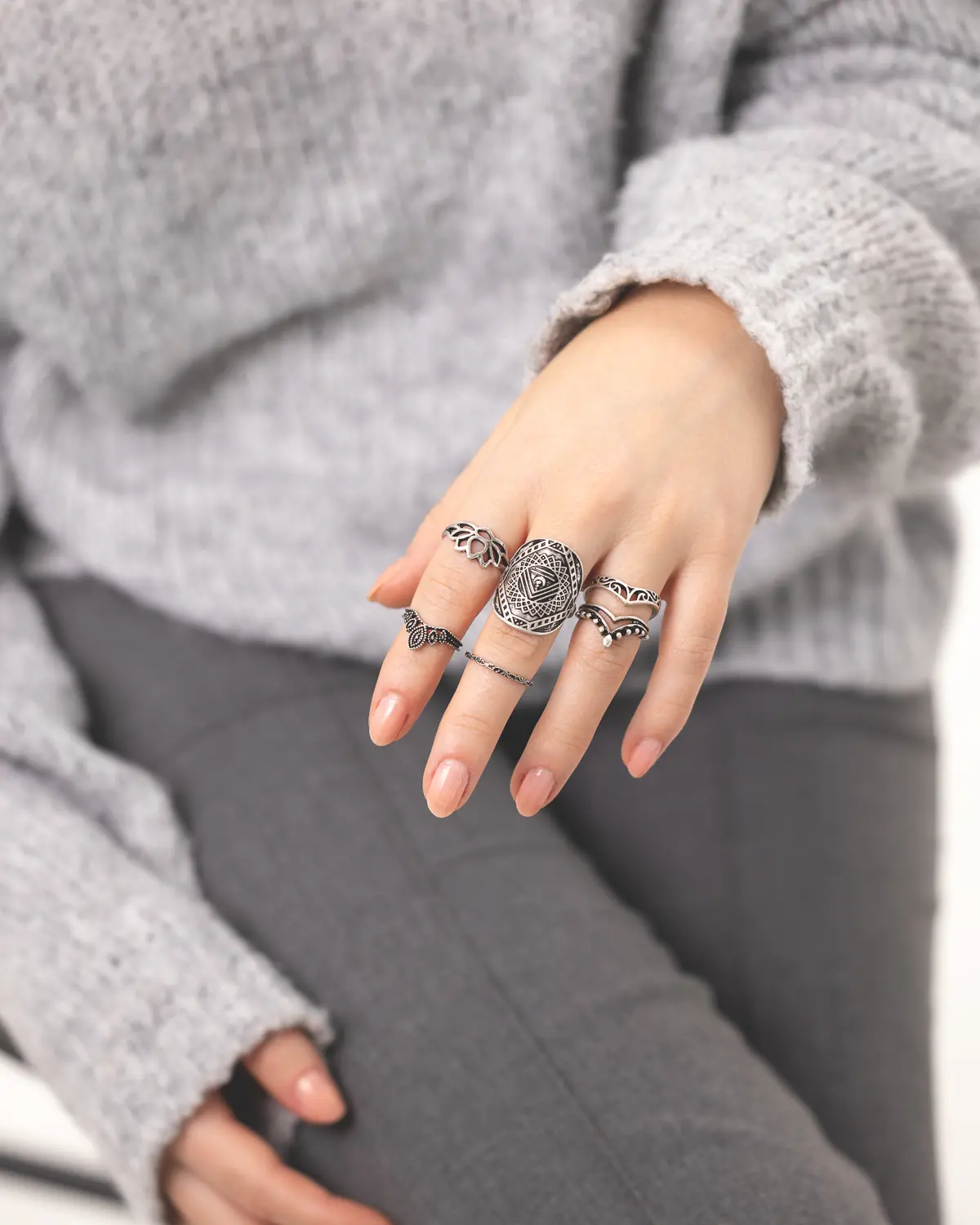Das Ring-Set – Boho Style schimmert silberfarben und besteht aus sechs Ringen in ähnlichen Designs. Die Ringe haben eine Boho-Optik und alle verschiedene Formen.