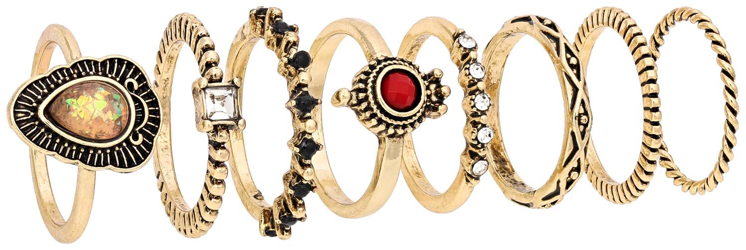 Das Ring-Set – Golden Boho funkelt in goldfarben und besteht aus 8 Ringen. Die Ringe haben unterschiedliche Designs und GröĂen. Sie sind teilweise mit Strasssteinen verziert, haben eine gedrehte Optik oder eine geriffelte Struktur.