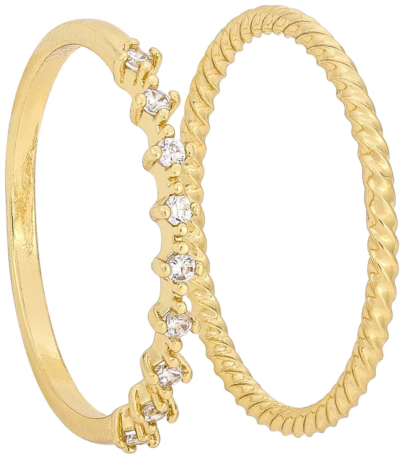 Das Ring-Set – Golden Zirkonia schimmert goldfarben und besteht aus zwei vergoldeten Ringen in unterschiedlichen Designs. Ein Ring ist mit kleinen Cubic Zirkonia Steinen verziert. Der andere Ring hat eine gedrehte Optik, jetzt entdecken im Online-Shop von Bijou Brigitte!