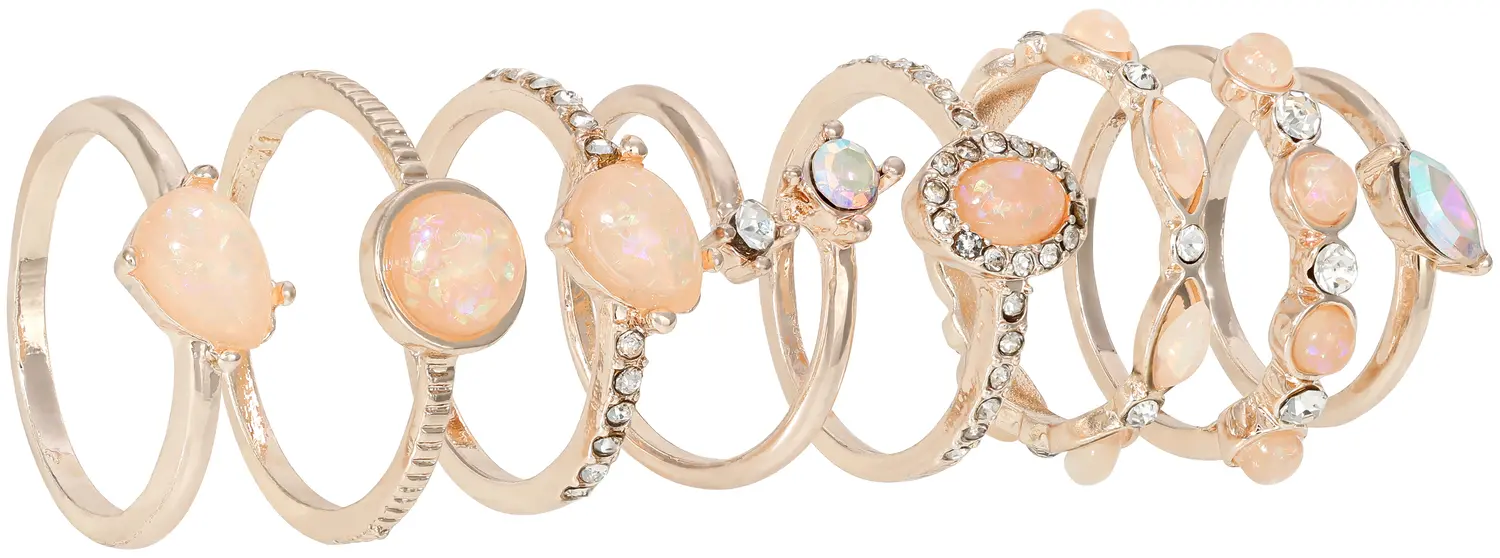 Das Ring-Set – Rosegold Chic besteht aus acht Ringen, welche in rosĂ©goldfarben schimmern. Die Ringe haben unterschiedliche Designs und GröĂen. Alle Ringe sind mit funkelnden Strass- oder Harzsteinen verziert.
