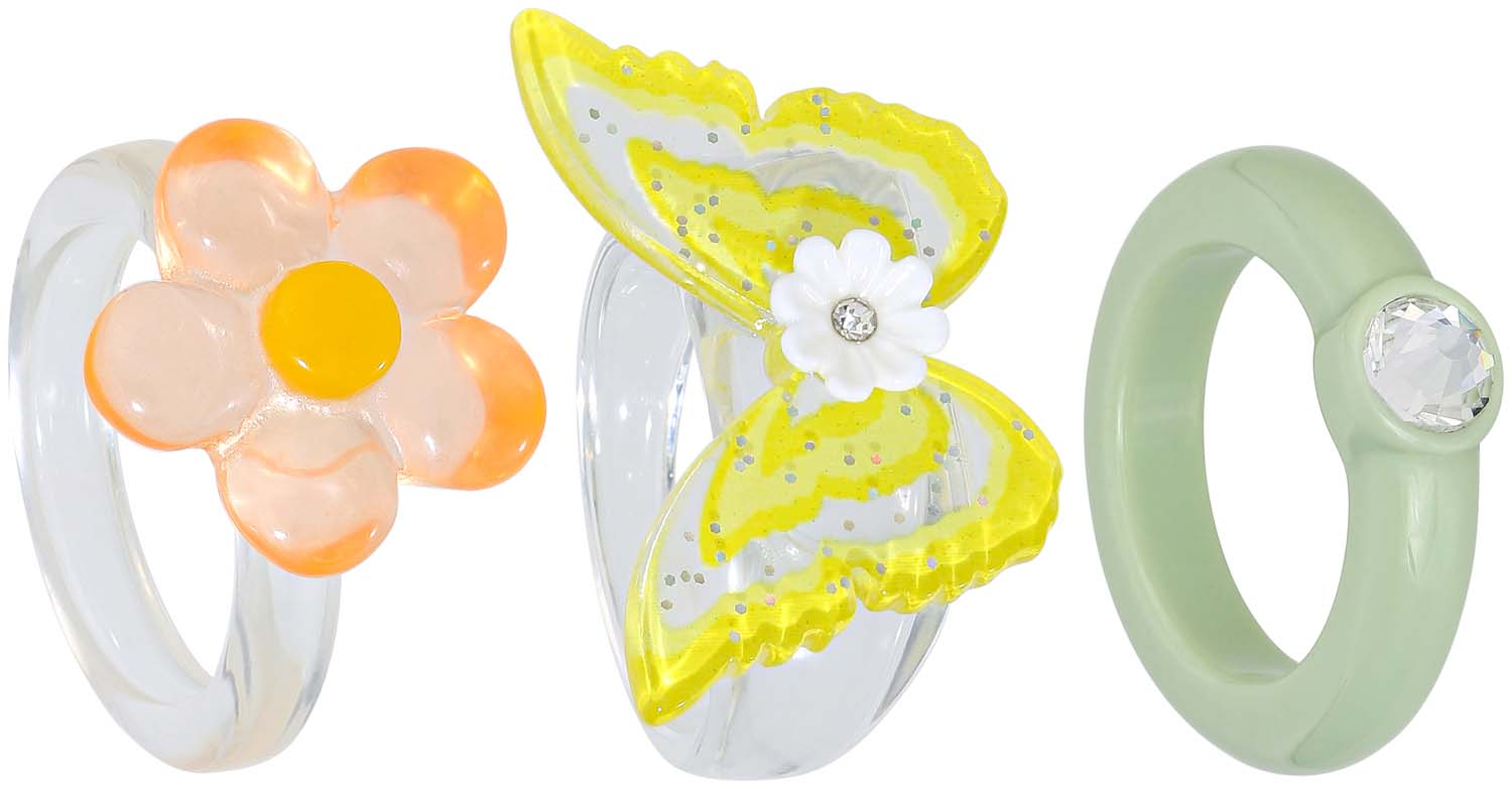 Das Ring-Set – Spring Time ist ein dreiteiliges Set aus Kunststoffringen mit verschiedenen Verzierungen. Die teilweise transparenten Ring sind mit einer Blume, einem Schmetterling oder einem Strassstein beschmĂŒckt.