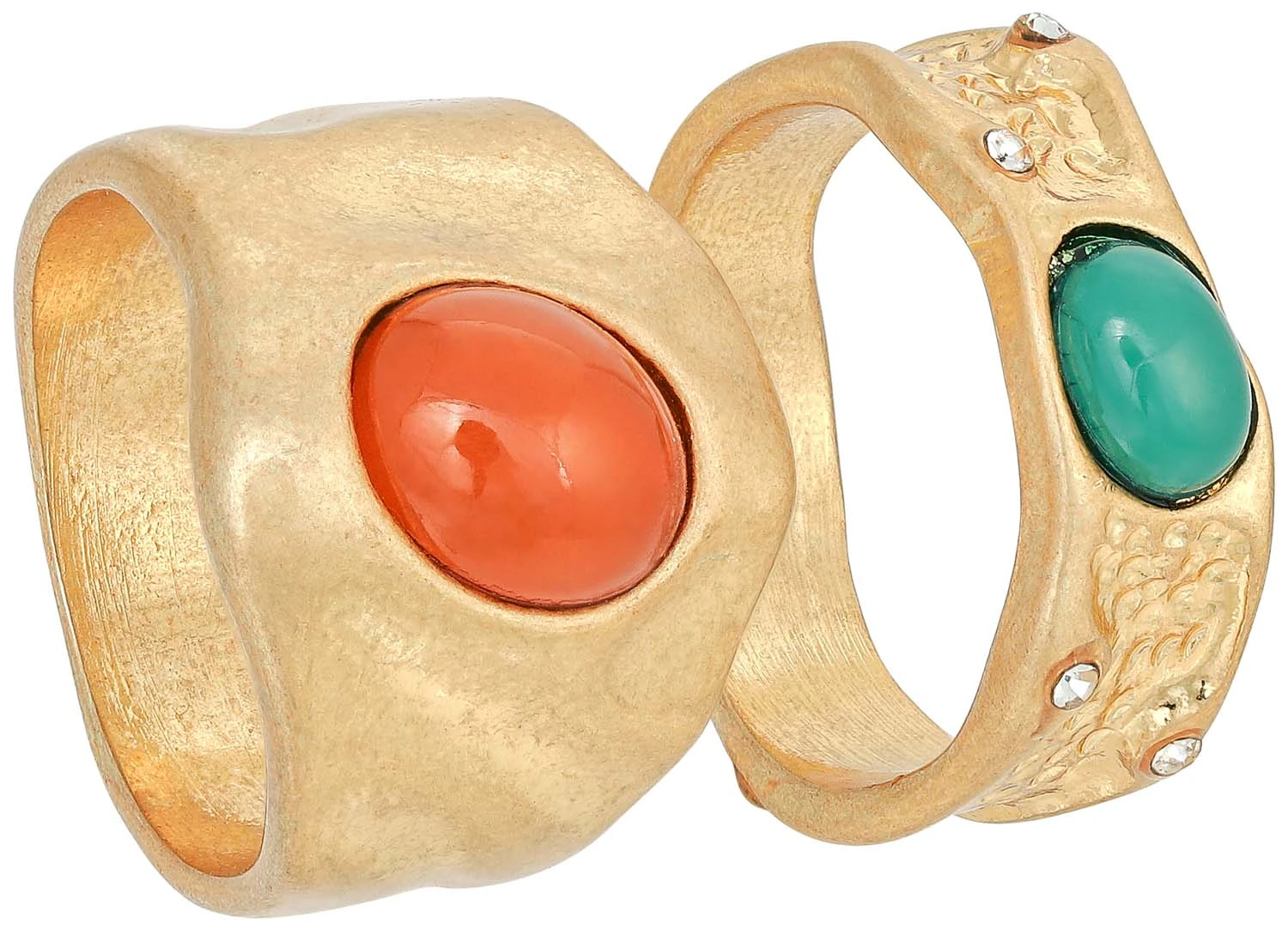 Das Ring-Set – Vintage Gold besteht aus zwei Ringen in unterschiedlichen Designs. Die Ringe schimmern goldfarben und sind mit einem grĂŒnen und orangenem Strassstein verziert. Die Ringe haben eine asymmetrische Form, jetzt entdecken im Online-Shop von Bijou Brigitte!