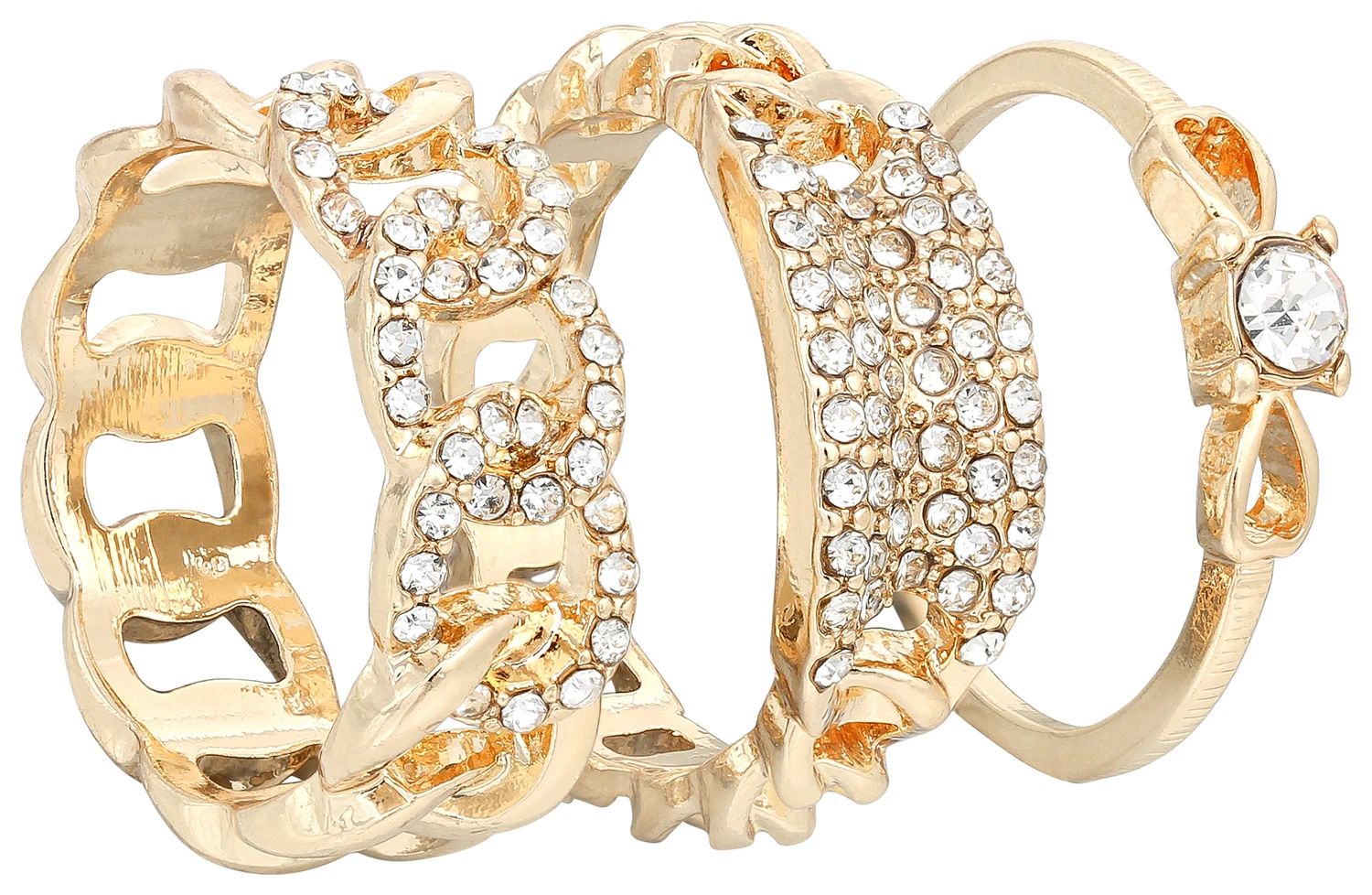Das Ring-Set – With Style in der Farbe Gold besteht aus drei auffälligen Ringen, die mit Strass-Steinen verziert sind.