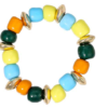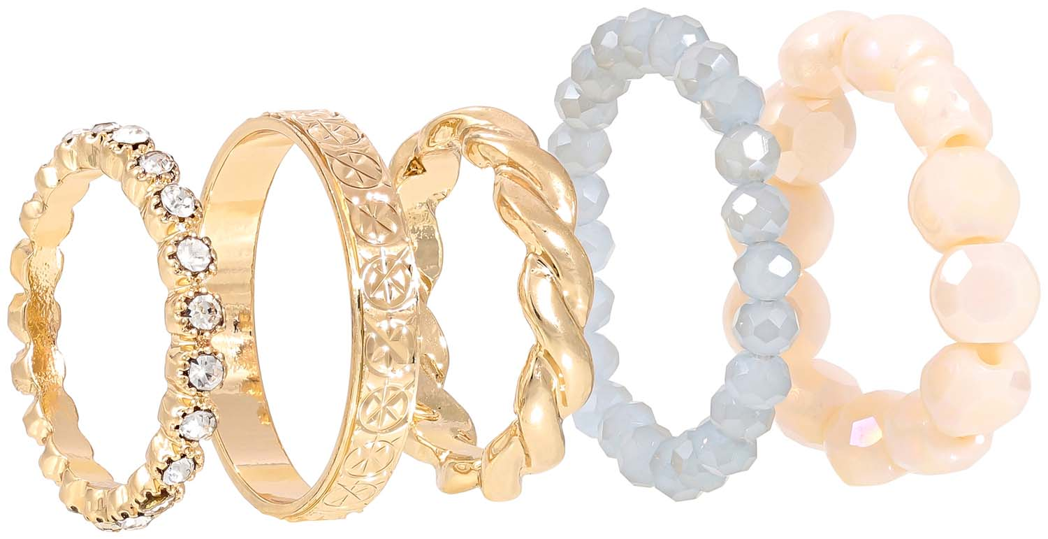 Das Ring-Set – Wonderful Beads besteht aus fĂŒnf Ringen in unterschiedlichen Designs. Zwei sind mit Kunststoffperlen verziert und sind dehnbar. Die anderen Ringe schimmern goldfarben und einer ist mit Strasssteinen verziert.