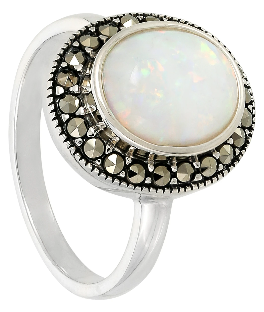 Der Ring – Shining Opal besteht aus 925er Echtsilber und hat eine ovale Form. Kleine facettierte Steinchen umgeben den syn.Opal, der bei Lichteinfall in verschiedenen Farben leuchtet.