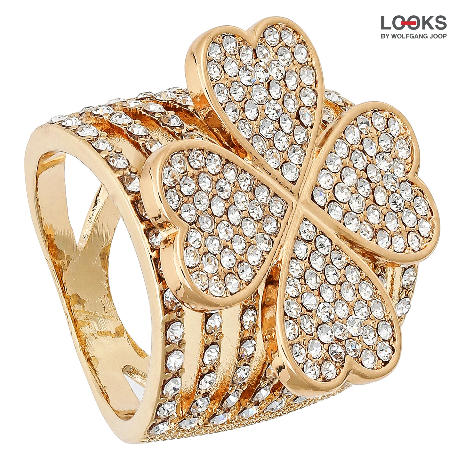 Der Ring – Sparkling Luck funkelt goldfarben und ist in der Form eines Kleeblatts. Der Ring ist mit Strasssteinen verziert, jetzt entdecken in der LOOKS by Wolfgang Joop Kollektion bei Bijou Brigitte!