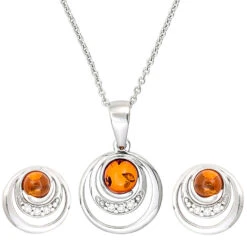 Das Schmuckset – Shiny Amber ist silberfarben und besteht aus 925er Echtsilber. Der Anhänger der Kette und die Ohrstecker sind mit einem runden Bernstein und mit Cubic Zirkonia Steinen verziert.