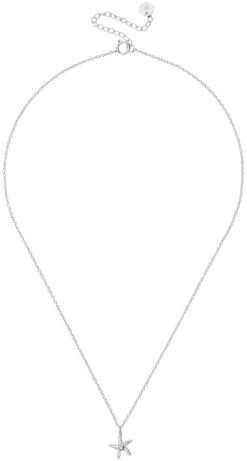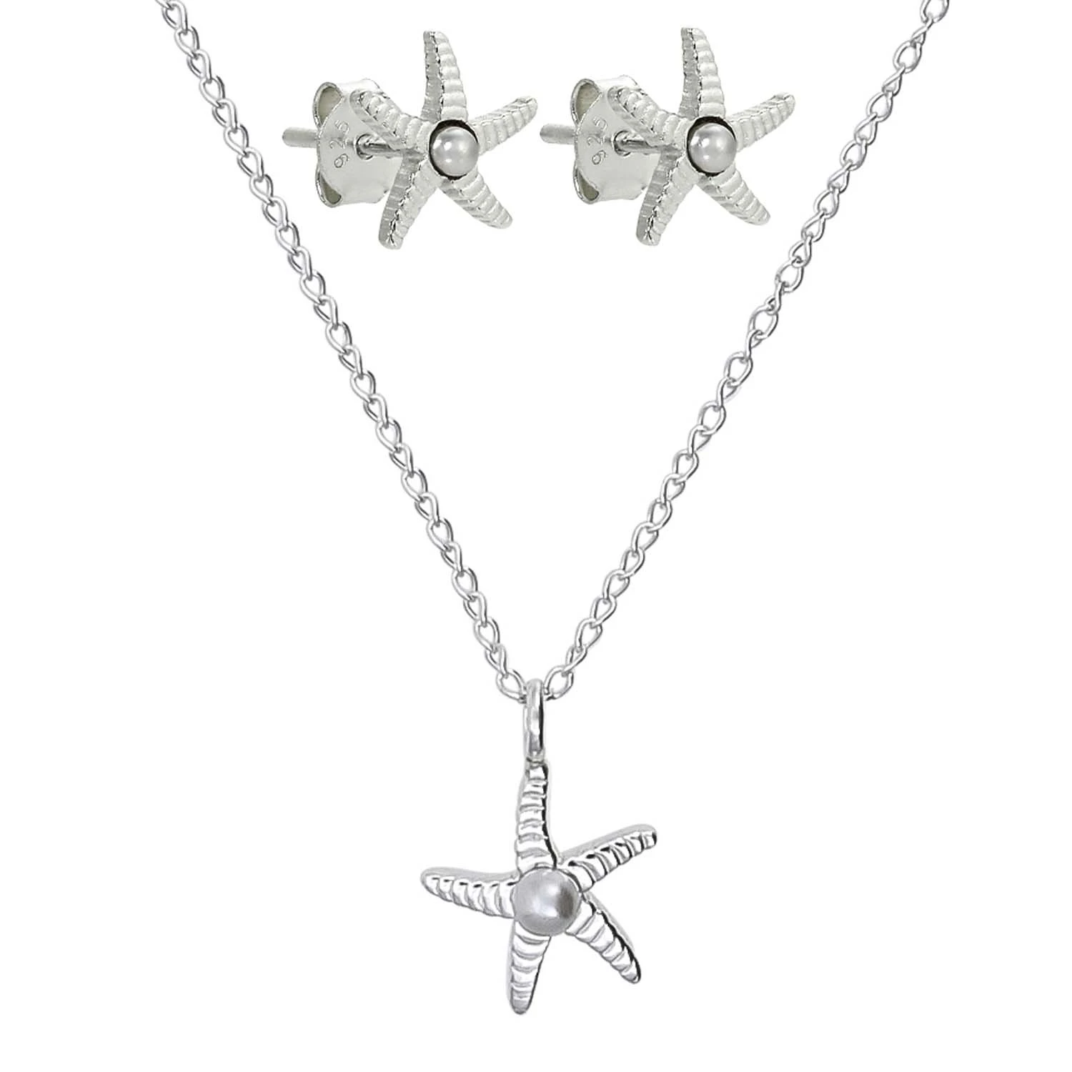 Set – Silver Starfish schimmert silberfarben und besteht aus einem Paar Ohrsteckern und einer Kette. Die Ohrstecker und der Anhänger der Kette sind in der Form eines Seesterns. Die Seesterne sind mit einer Kunstperle verziert.